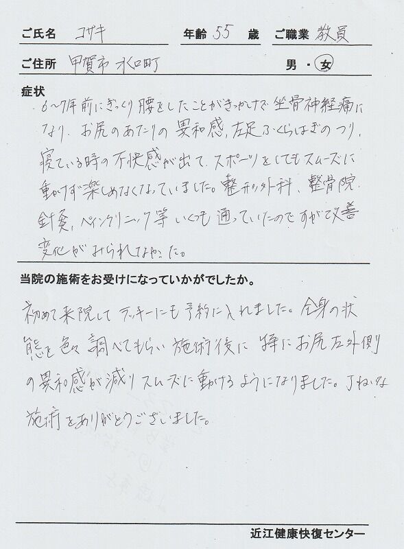 甲賀市水口町からお越しの55歳の女性の患者さんです。